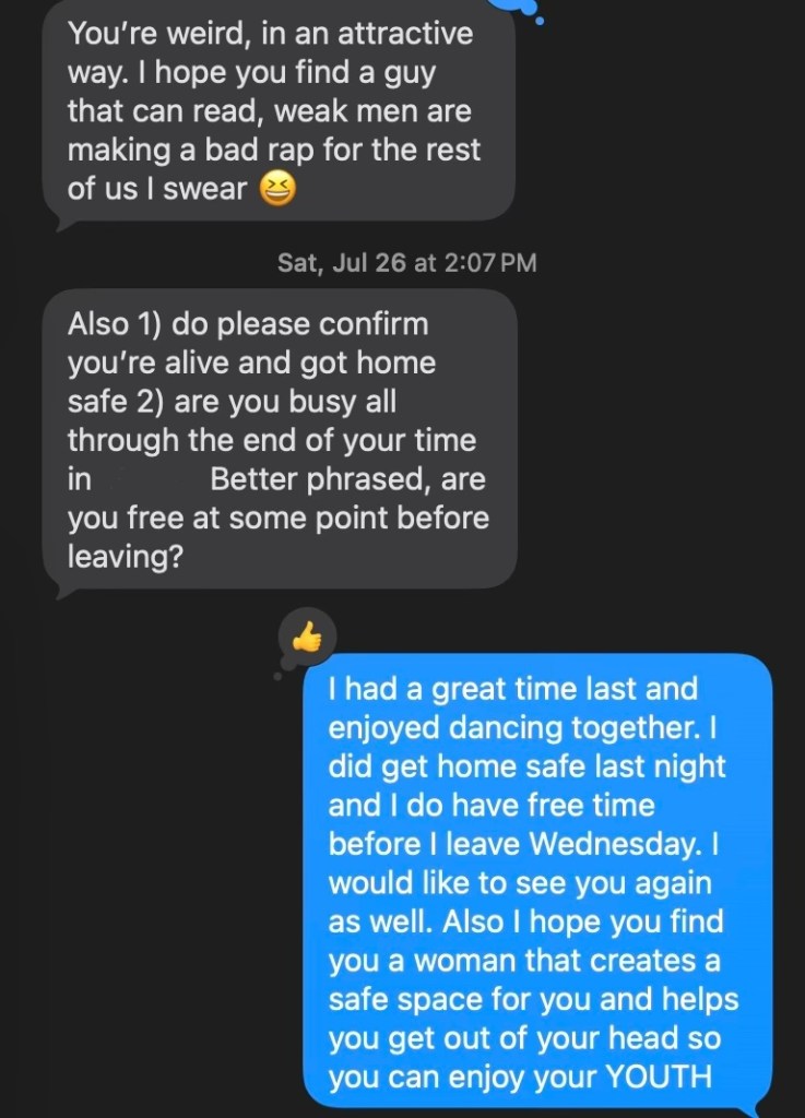 Now I know this could be a line, but you can usually tell the type. This was genuine, and he is indeed a man afraid of coming off as performative in any way (which can be very annoying at times). He visited me the next day in my office to have some banana pudding I bought to share. We spent the next two weeks just spamming text messages and memes to each other about various topics, and I was always very excited to see what our next conversation would be about. I did not see him again until almost two weeks after our initial meeting, and that was on a Sunday when I was out with my cousin. He texted me saying he believed he just saw me and came over to greet me at the table. Now, we are both in a HUGE city, so the chances of us running into each other were extremely slim. Earlier that day, I had hoped I might see him somehow, but I knew I would be pretty far from where he lives in the city. I am not sure if it was because I was drunk or something else, but when I saw him at the table, I instantly became coy and excited. An hour later, I texted him to let him know I had one more weekend in the city if he wanted to see me. We planned to hang out that Friday.